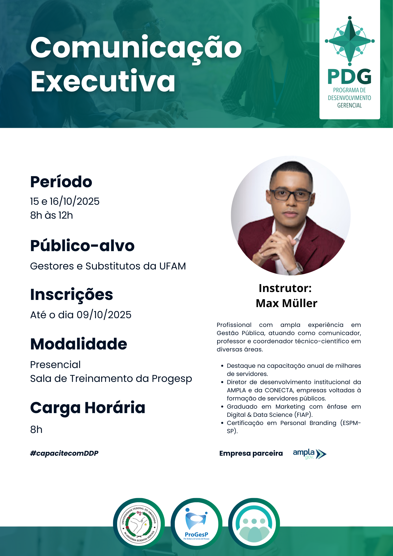 O Departamento de Desenvolvimento de Pessoas da PROGESP convida Gestores e Substitutos para a próxima ação do nosso Programa de Desenvolvimento Gerencial - PDG 2025 - Comunicação Executiva em parceria com a empresa Ampla Gov.