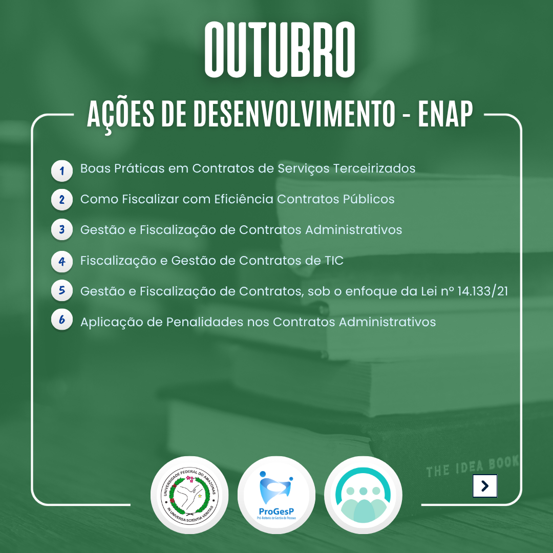 O Departamento de Desenvolvimento de Pessoas da PROGESP indica ações de desenvolvimento para o mês de Outubro ofertadas pela ENAP e solicitadas no Plano de Desenvolvimento de Pessoas - PDP UFAM 2025.