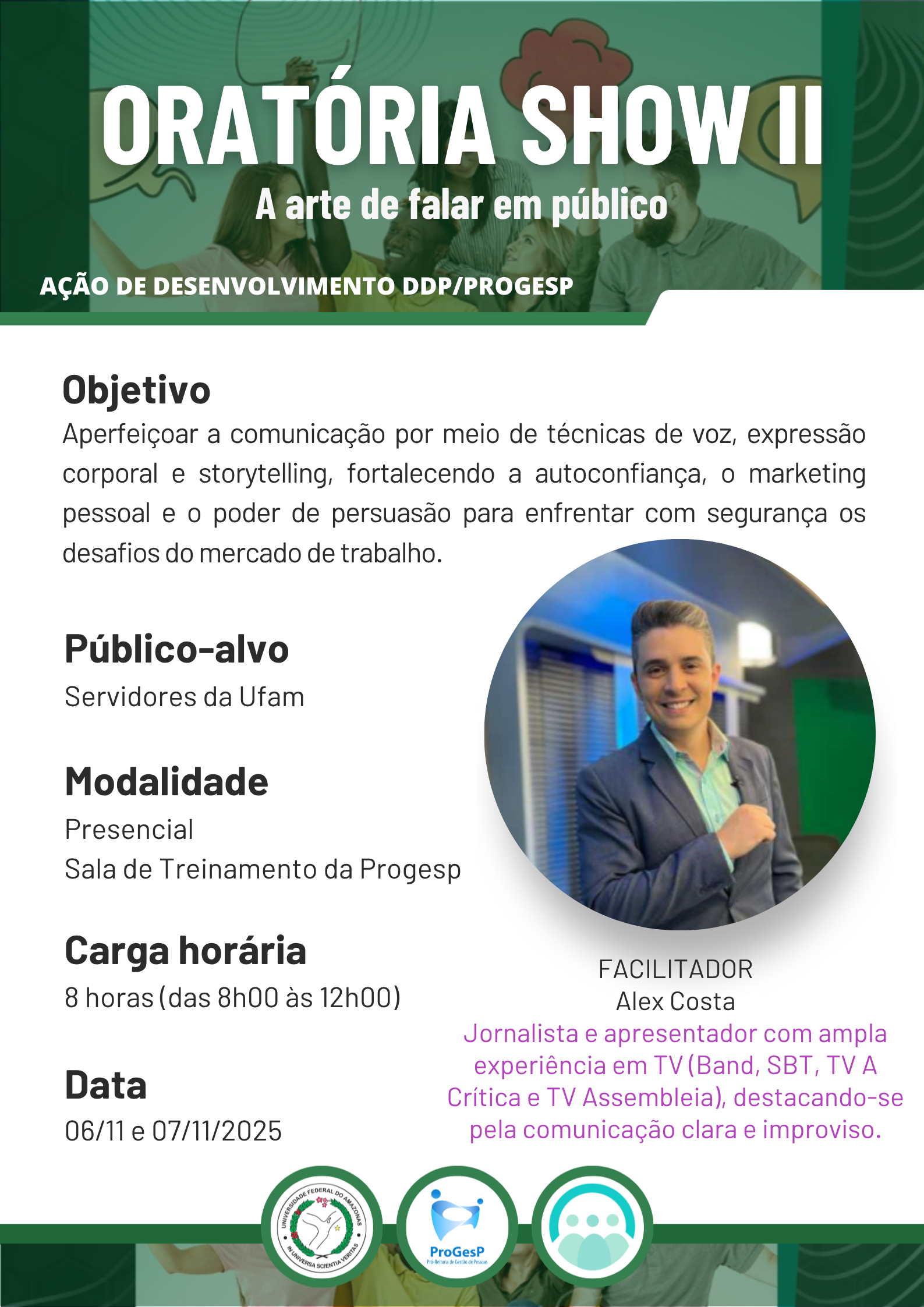 O Departamento de Desenvolvimento de Pessoas da PROGESP convida os servidores para participar da ação Oratória Show II - A Arte de Falar em Público em parceria com a Instituição Orbi RH.