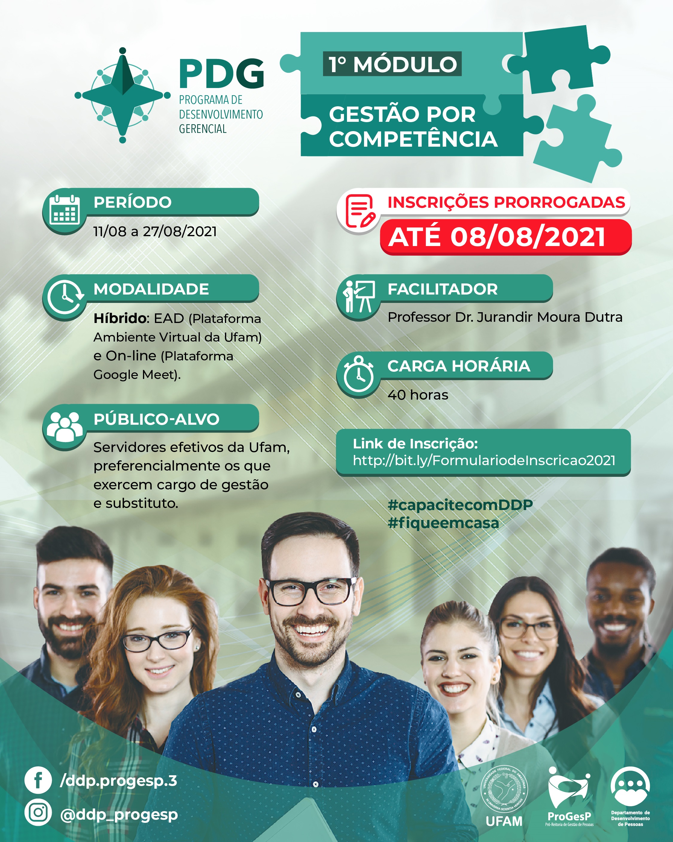 O Departamento de Desenvolvimento de Pessoas da PROGESP divulga o Programa de Desenvolvimento Gerencial (PDG) - 1° Módulo: Gestão por Competência, a ser realizado no período de 11 de agosto a 27 de agosto de 2021, na modalidade Híbrido- EaD (Plataforma Ambiente Virtual da UFAM) e On- Line (Plataforma Google Meet).