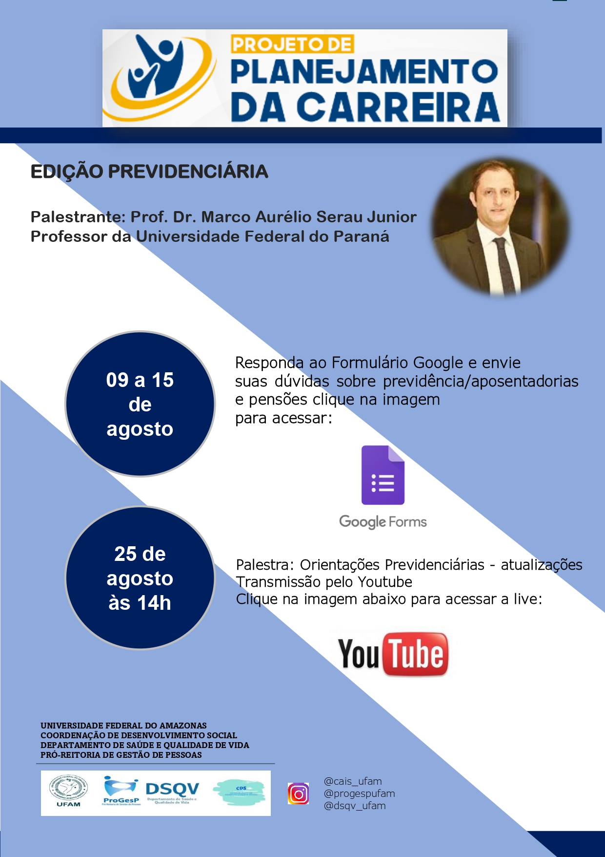 A Coordenação de Desenvolvimento Social através do Departamento de Saúde e Qualidade de Vida da Pró-Reitoria de Gestão de Pessoa apresenta a nova edição do Projeto de Planejamento da Carreira - PPC, com a palestra “Orientações Previdenciárias - atualizações”, a ser ministrada pelo Prof. Dr. Marco Aurélio Serau Junior, da Universidade Federal do Paraná.