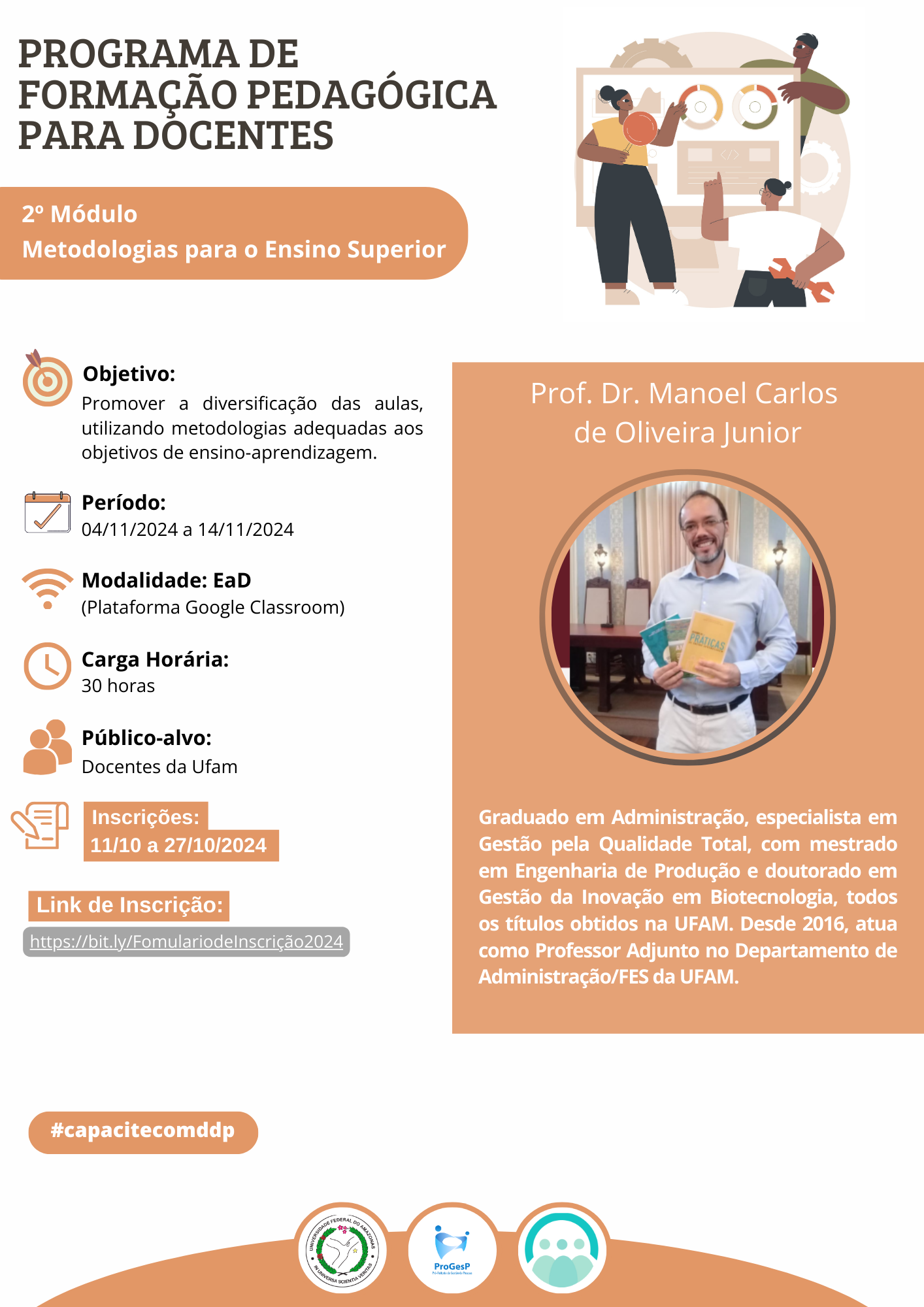 O Departamento de Desenvolvimento de Pessoas da PROGESP divulga a ação Formação Pedagógica para Docentes - 2° Módulo: Metodologias para o Ensino Superior. O objetivo dessa ação é promover a diversificação das aulas, utilizando metodologias adequadas aos objetivos de ensino-aprendizagem.