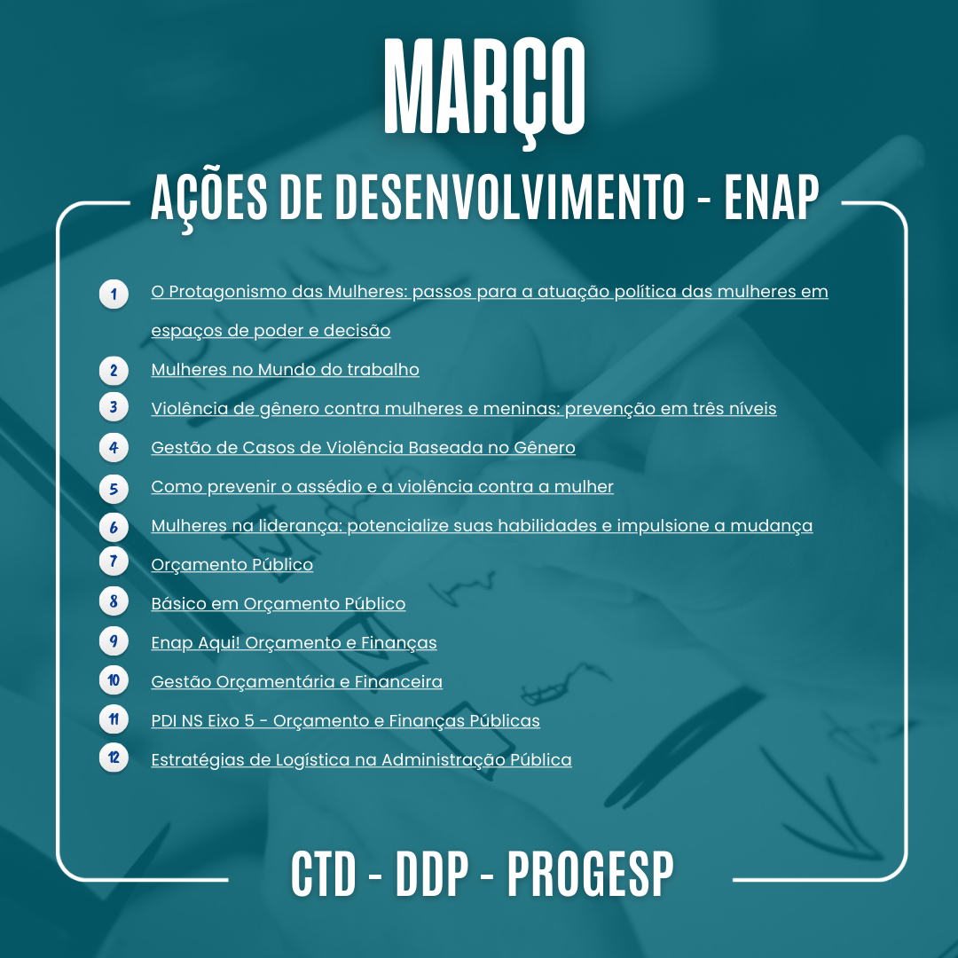 O Departamento de Desenvolvimento de Pessoas da PROGESP selecionou ações de desenvolvimento estratégicas ofertadas pela ENAP, em celebração ao Mês Internacional das Mulheres. Estas capacitações fazem parte do PDP UFAM 2026 e unem o fortalecimento do protagonismo feminino à excelência técnica.