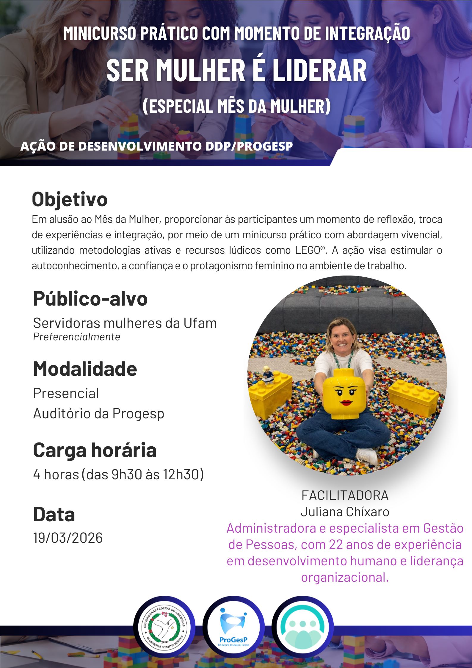Público-alvo: Servidoras docentes e técnico-administrativas da Universidade Federal do Amazonas (UFAM) e empregadas públicas da INFRAERO interessadas no desenvolvimento de competências relacionadas à liderança, desenvolvimento pessoal e atuação profissional.